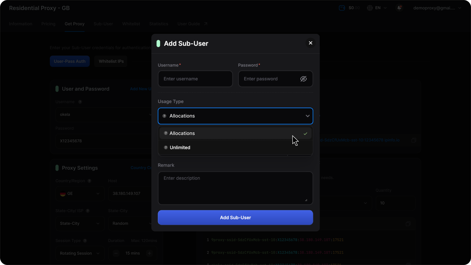 Click Add Sub-User to save. You can now select this Sub-User (username + password) for your proxy connection.