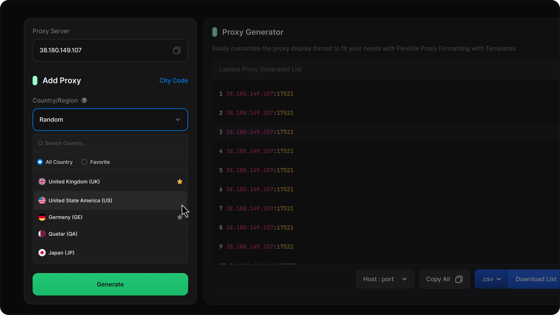 **Note**: If you want to export your proxies, you can copy them directly or download the list as a .txt or .csv file for external use.