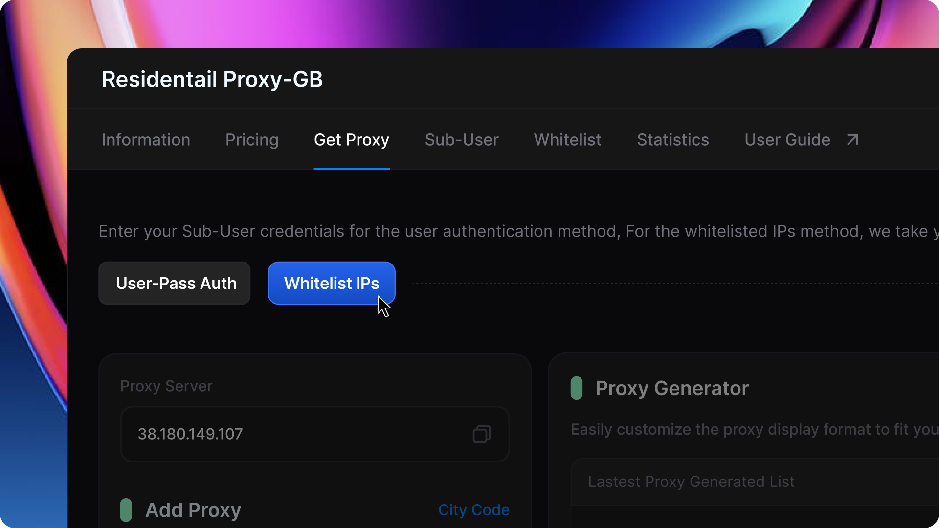 The IP Whitelisting method allows you to connect to 9Proxy’s Residential Proxy network without entering a username or password.