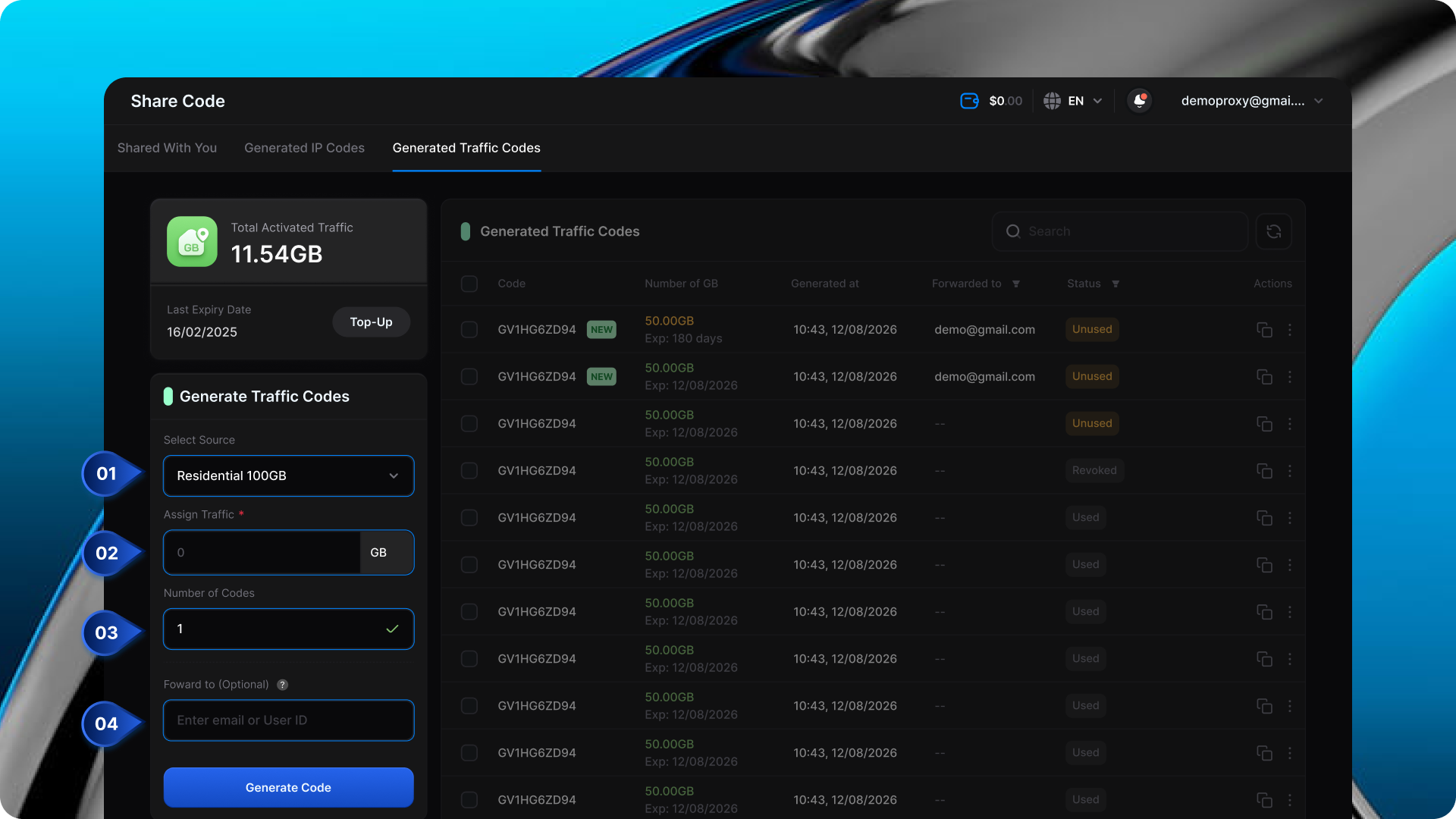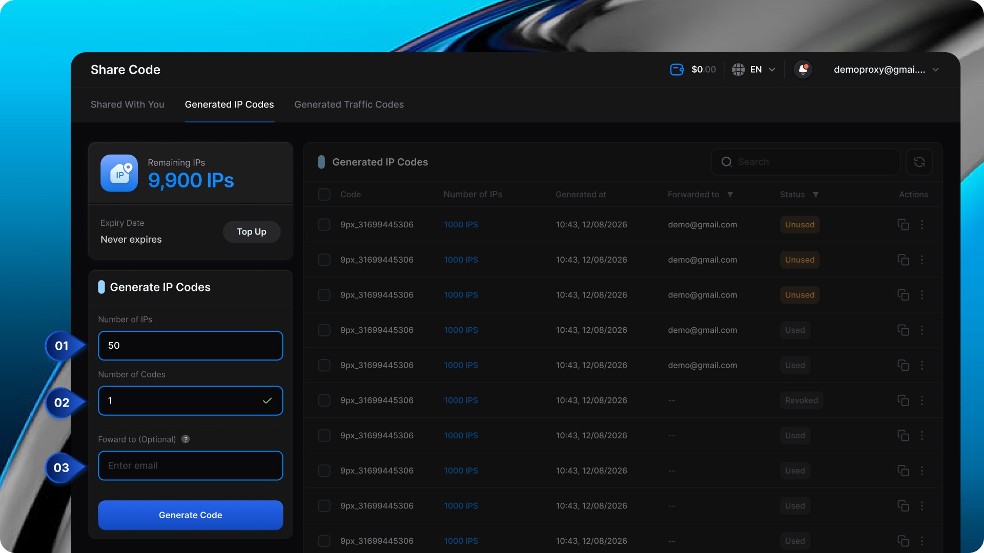 The Share Code feature in 9Proxy lets you securely share your proxies with other 9Proxy users - perfect for teams, businesses, or collaborative workflows.